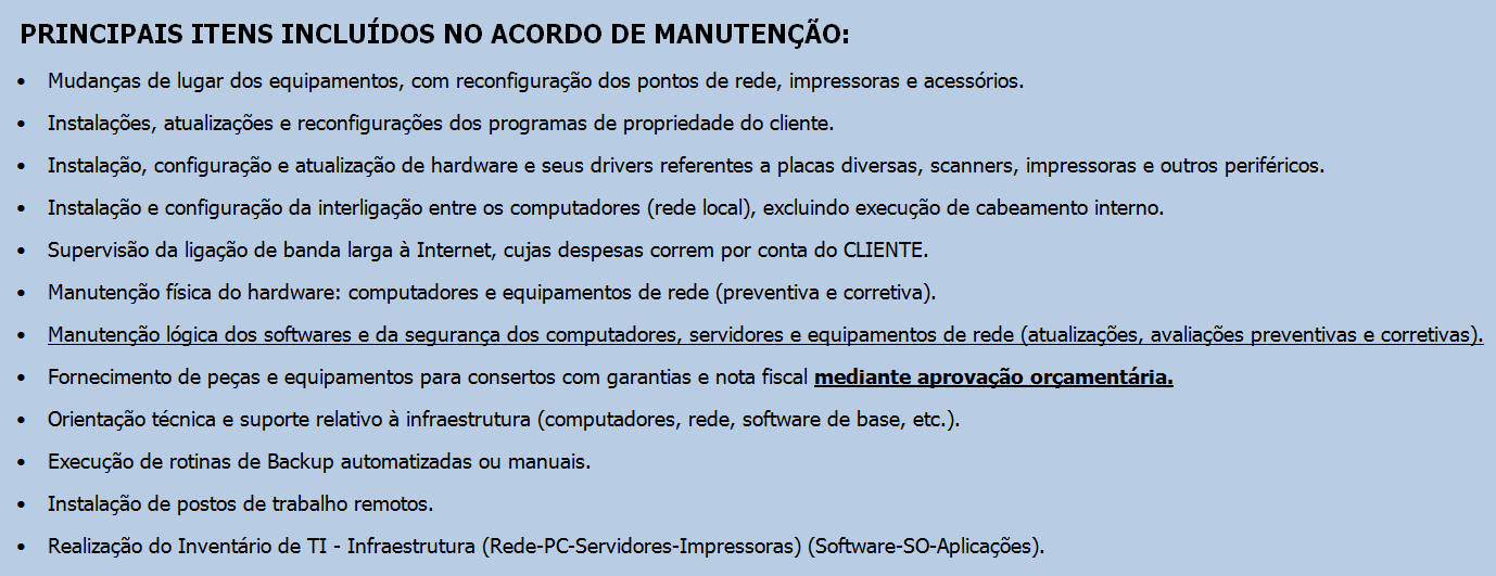 Com o acordo de manutenção, você e seus funcionários poderão fazer chamados telefônicos, por e-mail ou por chat aos nossos técnicos, especificando o problema de TI. Testes serão feitos para determinarmos os defeitos e uma pronta solução será dada. A assistência é feita por telefone, visita técnica ou por atenção remota, onde utilizamos um software seguro e proprietário, onde as informações são encriptadas enquanto ocorre o vínculo (semelhante ao atendimento on-line utilizado pelos bancos).